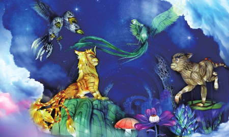奇幻風格的桃花路上,《山海經》中的仙山海景和祥瑞神獸也來助陣。渾身毛發(fā)雪白的九尾狐,三頭六尾名叫鵸的鳥妖、吼聲震天名叫狌狌的犲山獸、立于昆侖山巔遙望東方的陸吾、三首六尾夜半怪笑的鵸鵌、悠然自得的麋鹿、充滿神秘色彩的青鸞、抬腿準備騰云的飛馬……置身其中,仿佛斗轉星移,滄海桑田。地面的點點星光,營造出神秘夢幻的奇趣山海世界。