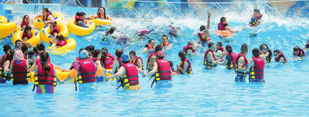 走進(jìn)精衛(wèi)水世界,陽(yáng)光、椰林、沙灘,以及南方綠色植物景觀和卡通造型,讓人仿佛置身空氣清新、陽(yáng)光明媚的海邊城市。這里可以體驗(yàn)以海浪海嘯為主題的探險(xiǎn),在大喇叭、彩虹滑梯、大型水寨等水上娛樂(lè)項(xiàng)目間穿梭嬉戲,感受水世界的無(wú)限清涼。在冒險(xiǎn)廣場(chǎng),最刺激的和好玩的都在這里——大擺錘、魔法過(guò)山車(chē)、旋轉(zhuǎn)杯、海盜船、高空飛行、旋轉(zhuǎn)木馬、碰碰車(chē)、蹦極、火箭蹦極、尖叫、飛鷹、探空飛梭……光是聽(tīng)到游客的尖叫聲,就令人興奮起來(lái)。特別是勇者無(wú)懼的蹦極,看似放棄一切的縱身一躍,竟也是將自己心靈放空所尋求的“涅槃”。