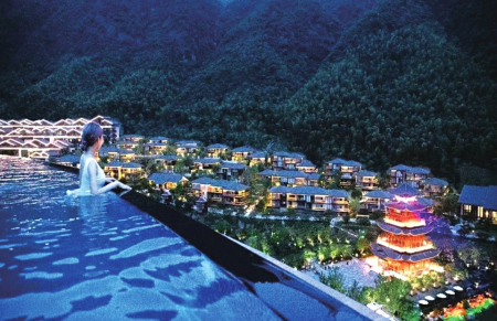 徜徉泳池,可觀(guān)落日余暉、滿(mǎn)天星辰,一邊是古風(fēng)古韻的漢唐建筑,一邊是綠意正濃的山林竹間;一半是封存塵世的自然風(fēng)景,一半是觸手可及的浪漫風(fēng)情。俯瞰葛仙村,盡享古韻之美。傍晚,落日余暉均勻曬在水面上,散為金光,而晚霞,也幻成異樣的色彩,一層層的光和色,相互交融著,“落霞與孤鶩齊飛,秋水共長(zhǎng)天一色”的意境就是如此吧。夜里輕柔的晚風(fēng),拂過(guò)泳池,水波粼粼,被周邊的燈光映襯得就像無(wú)數(shù)的水晶鋪設(shè)在水面上,星空與池底交相呼應(yīng),帶來(lái)無(wú)盡的浪漫氣息。