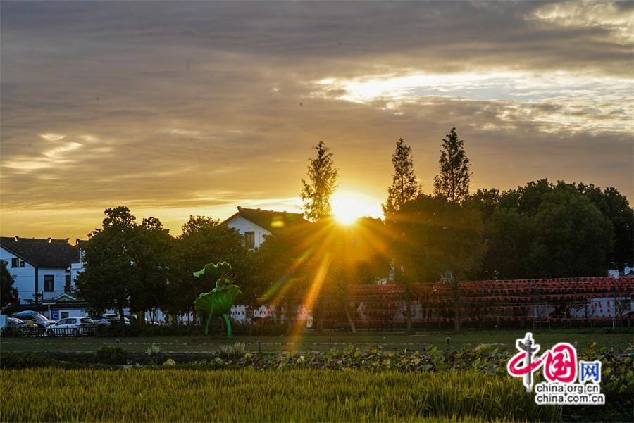 傍晚時分抵達香村,收獲了一場驚艷的落日美景,云層色彩在光線折射下不斷變化,忽而紅如火,忽而燦如金,忽而粉如煙,再到最后一抹落日的余暉撒遍整個村莊,稻田村舍,樹木小花,一切都籠罩在一片祥瑞的金光里,如夢似幻……這應是我見到過的最美江南晚霞。
