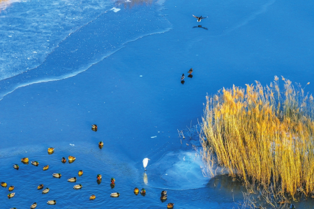 成群的綠頭鴨在方山縣北川河畔時而展翅飛翔,時而覓食戲水,為冬日增添了幾許靈動。