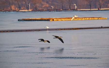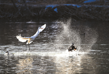 冬日的太原市汾河濕地公園生機盎然,鳥兒翔集。