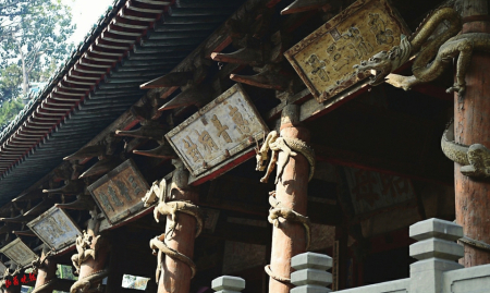 站在圣母殿前,八根木雕盤龍尤其搶眼,居中兩柱上的叫應龍,次兩柱上的稱蟠龍,再次兩柱上的為蛟龍,最邊兩柱上的無角者謂之螭龍。