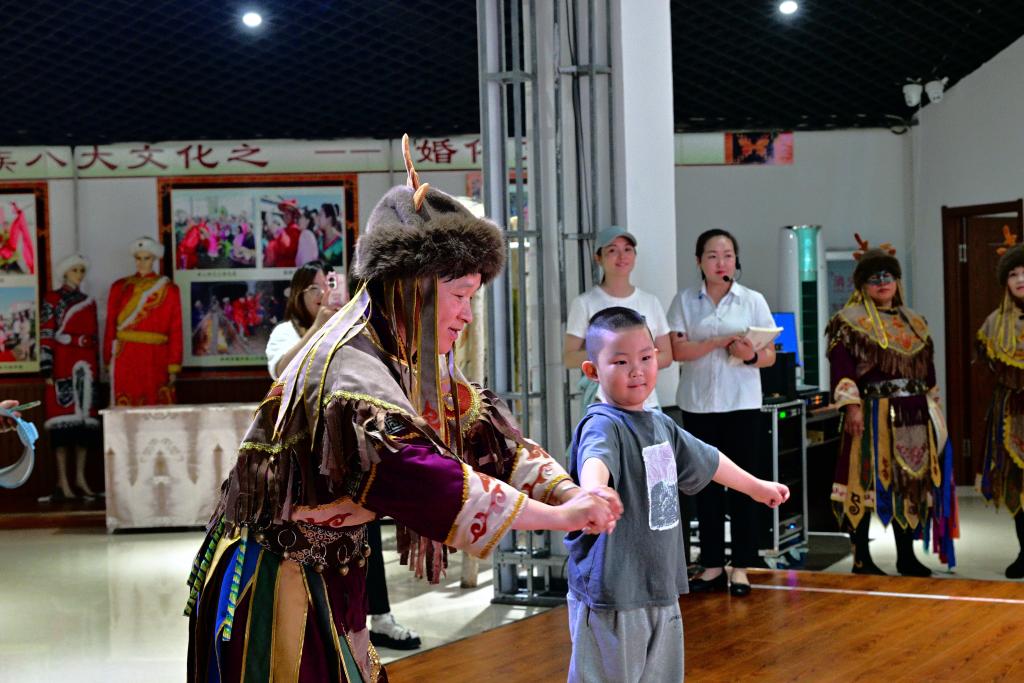 在展示館二樓活態(tài)展示區(qū),赫哲族演員頭戴鹿角帽,身穿民族服裝,跳起熱烈的“溫吉尼”舞蹈,為前來參觀的游客帶來一場神秘又震撼的視聽盛宴。表演結束后,游客還可以走上舞臺,和演員們學習薩滿舞的舞蹈動作,體驗赫哲族古老的文化。