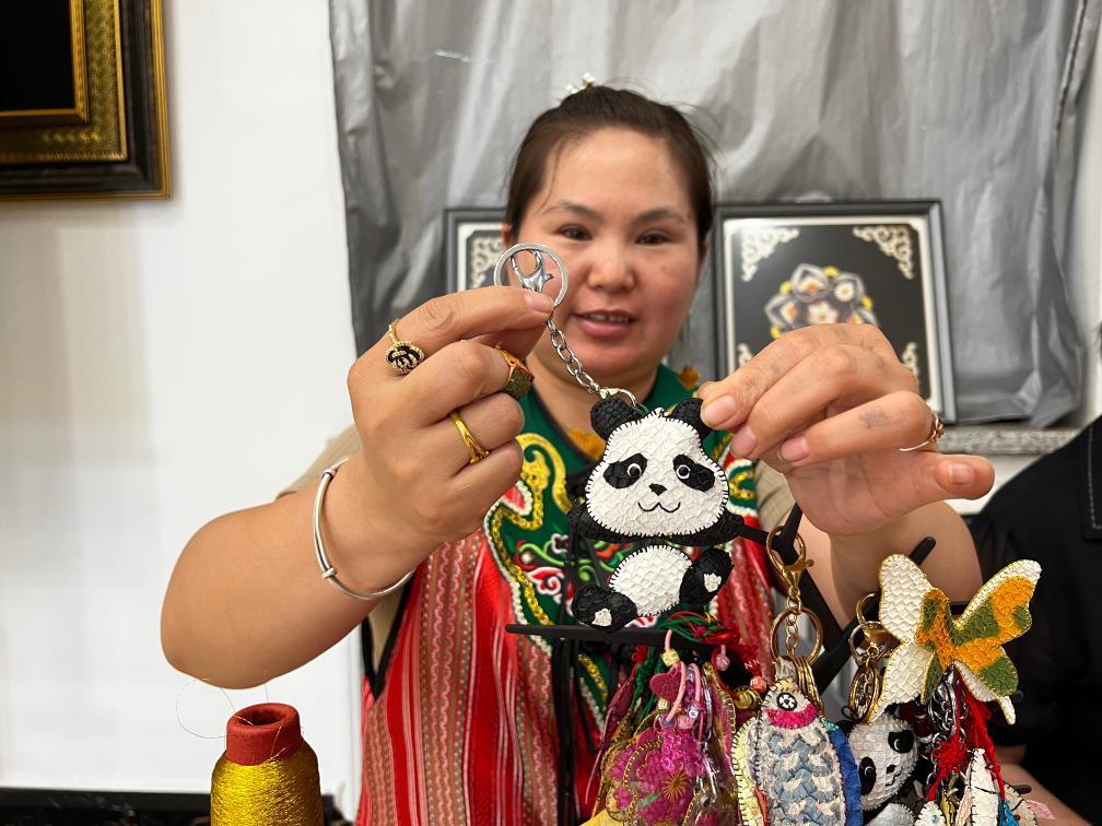 同江市非物質文化遺產(chǎn)展示館內,赫哲魚皮匠人展示由她制作的大熊貓魚皮掛飾。新華社記者 楊軒 攝