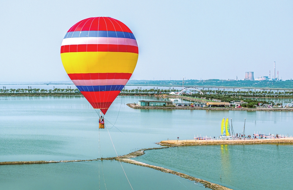 9月7日,游客在運城鹽湖景區(qū)乘坐熱氣球觀賞鹽湖美景。近日,該景區(qū)推出“乘坐熱氣球 觀七彩鹽湖”體驗游覽項目,讓游客感受別樣的鹽湖風景。
