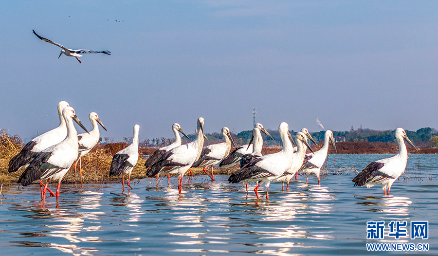 12月19日,安徽省合肥市廬江縣黃陂湖濕地,國(guó)家一級(jí)保護(hù)動(dòng)物東方白鸛在此嬉戲、覓食,自由飛翔。