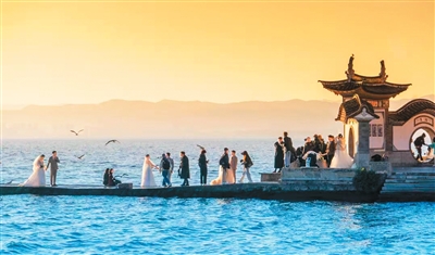 多對(duì)新人在云南大理洱海邊拍攝婚紗照。趙 渝攝