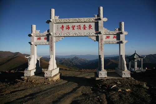 望海峰的盛景在于東觀日出。由于東面再無大山阻擋,所以人的目力可東眺非常遙遠(yuǎn)的地方。峰頂曾建有望海樓,專門為觀景而建??上昃靡褮?,1985年重建,為望海寺,內(nèi)供聰明文殊。有史籍記載日出之壯麗景象:“每當(dāng)蒸云寢壑之隙,爽氣澄秋之際,于日出扶桑之時(shí),可望紅日十倍于車輪,紅輪之下,隱隱水光閃爍,若波若鏡,瑰麗非凡。1977年8月,趙樸初先生登東臺(tái)觀日出后乘興填詞《五臺(tái)雜詠·調(diào)寄憶江南》,形象描繪了東臺(tái)日出之勝景: