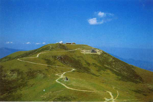 五臺山的西臺人稱掛月峰,又名明月山,海拔2773米?!肚鍥錾街尽份d:西臺“頂廣平,月墜峰巔,儼若懸鏡,因以為名”。臺頂有泉,群山拱合,巖谷幽深;臺頂亦有寺,名叫法雷寺,內(nèi)供獅子吼文殊,其寓意是讓強大的獅子吼叫聲驚醒眾生。整個山勢峰巒疊嶂,如同孔雀開屏。
