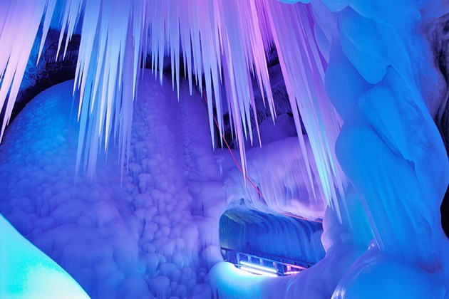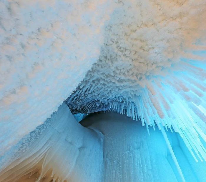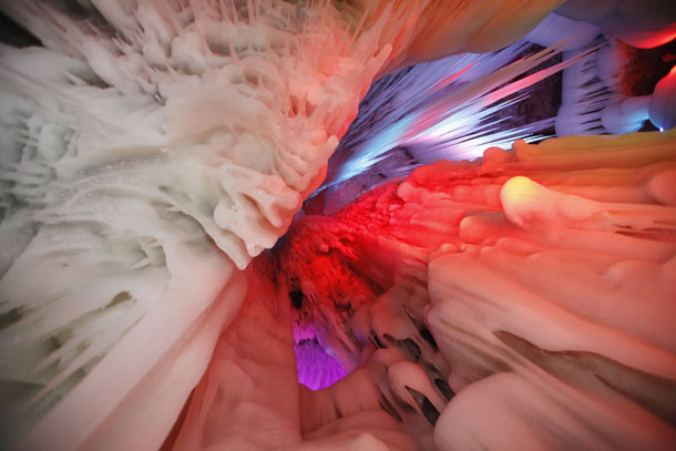 第二天一早,閆鵬和他的朋友全副武裝再次來到了這里,決心對這個洞探個究竟。他們拉了一條繩子進入洞中,里面黑咕隆咚,腳底滑得根本沒有腳蹬的地方。后來到了一個稍微開闊的地方,站穩(wěn)腳之后,拿火把四周一看,眼前豁然開朗。他們仿佛置身于一座晶瑩的宮殿,四處都是冰的世界:冰柱、冰錐、冰瀑、冰筍、冰花。