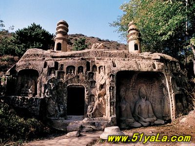 羊頭山正面高峰凸起,左右山脈前伸,形如箕掌,石刻造像即分布于其間。 羊頭山石刻造像和石塔,是羊頭山歷史遺物中的精華所在。它的分布,有的在山巔,有的在山腰,有的為窟,有的為龕,原有規(guī)模及順序已不可考,現(xiàn)狀可分為九區(qū)。較大窟龕二十二個(gè),小型佛龕八十多個(gè),窟洞平面多為方形。還有千佛碑一通,皆魏至唐物。山巔山腰雕石塔六座,唐制,高度4─6米不等,平面方圓兩種,高者七層,密檐式,低者兩層,樓閣式,形制古樸,手法簡潔,為他處所少見。 主峰極頂列為首區(qū),有石塔兩座,佛龕一區(qū),龕為三塊巨石疊成,下為臥羊,中為佛龕,上為瓦隴式屋頂,龕內(nèi)內(nèi)置一佛二菩薩,佛像結(jié)跏而坐,面型衣飾皆屬北魏風(fēng)格。 西南山巔(亦稱右峰)“八十八佛”窟,距羊頭石龕二百余米,列為第二區(qū)??啐惾齻€(gè),分上下兩層。前窟南向平面方形,門外二金剛侍立,窟內(nèi)正面一佛二菩薩,佛結(jié)跏而坐,菩薩侍立主佛四周,四周雕有龕八十七個(gè),內(nèi)各置一佛,皆坐式,連同主佛共八十八尊,窟名由此而來??吣弦积?,內(nèi)雕一佛二菩薩,面型略秀,身材修長。后窟較高,亦稱上窟,窟上石塔已毀壞。塔下一窟,方形,窗門南向,三面雕像,正面和西側(cè)主佛已不存,尚存東側(cè)一佛二菩薩和西隅左尊脅侍,面型清秀,神態(tài)自若,刻工純熟而洗練。視其造像風(fēng)格,與前窟同為齊隋間遺物。 第三區(qū)為千佛洞,位于半山腰部,窟內(nèi)方形,四面小佛龕滿壁,近千尊,故稱千佛洞。這里的雕像都是唐代風(fēng)格。第四區(qū)為方塔窟區(qū),第五區(qū)為圓塔窟區(qū),第六區(qū)為多寶龕窟區(qū),第七區(qū)為大石窟龕區(qū),第八區(qū)為佛山區(qū),第九區(qū)為唐代龕區(qū)。這些石窟龕內(nèi),雕像大都肌肉健美,衣飾貼體,藝術(shù)價(jià)值很高。 千佛碑,在清化寺址西,四面滿雕佛像,正面碑身中心雕火焰形大龕一區(qū),內(nèi)置坐佛一尊;側(cè)面中雕佛像兩龕,為一佛二菩薩。造像風(fēng)格,發(fā)髻光滑,面相方圓,寬衣博帶,肩膀較平,尚存魏碑風(fēng)格。 羊頭山石塔,是山上石雕作品中的一個(gè)組成部分,原為六座,兩座損毀,現(xiàn)存四座,分布于山巔和山腰。山巔兩塔,南北對(duì)峙,十里外皆可望見。山腰兩座,一方一圓。此處石塔雖然不大,但造型特殊,在我國已知的古塔中,尚屬奇構(gòu)。 (責(zé)任編輯:李冬梅) |