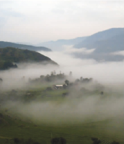 炊煙裊裊的村莊,偷偷地從薄霧里露出惺忪的臉來,時(shí)隱時(shí)現(xiàn),猶如傳說中的蓬萊仙島。一個(gè)個(gè)白族村莊沉浸在美輪美奐的仙境之中,整個(gè)峽谷布滿著一幅幅精美絕倫的淡墨山水畫??上У氖谴逯械娜藗冞€未品嘗出做神仙的滋味,霧海就隨著江面吹來的西風(fēng)越升越高,不一會兒,就向羅平山頂飄襲而來。我們幾個(gè)觀霧者迅即被淹沒在濃濃的云山霧海中,成了騰云駕霧的神仙了。遺憾的是我們還未過足神仙癮,那些飄蕩在山頂?shù)脑旗F就被熱烈而耀眼的太陽光收回去了,讓我們不得不回到人間,仍去做原來的凡夫俗子。