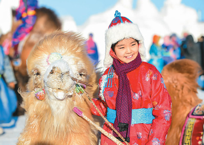 1月9日,內蒙古蘇尼特右旗第12屆駱駝文化節(jié)在賽漢塔拉鎮(zhèn)舉行。來自鄂爾多斯、呼倫貝爾以及蘇尼特和烏珠穆沁草原的牧民帶著200多峰駱駝在白雪覆蓋的草原上進行駱駝選美、駱駝競速等比賽。文化節(jié)還舉行了賽馬、搏克等蒙古族傳統(tǒng)體育活動。圖為一名蒙古族小朋友和駱駝合影。