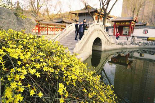 3月13日,玉蘭花、迎春花盛開在太原碑林公園,鮮艷的花朵與古香古色的碑亭相映成趣,游人漫步在花香之中,擁抱春天。本報記者 孫榮祥攝