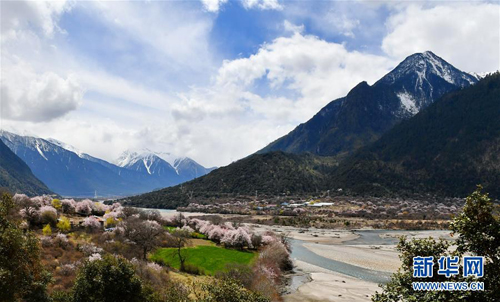 這是山腳下桃花掩映的村莊(3月31日攝)。日前,西藏林芝市波密縣的桃花相繼綻放,奇美景色令人流連忘返。新華社記者 張汝鋒 攝