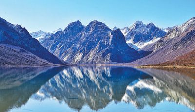 圖為10月下旬,初雪過后的年保玉則平湖如鏡。記者 姜峰攝