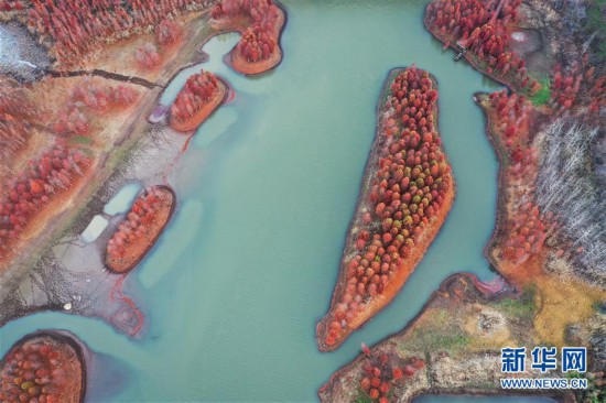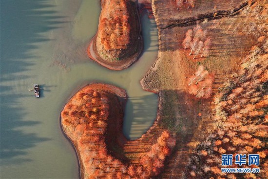 初冬之際,在江蘇盱眙天泉湖畔,連片的紅杉呈現(xiàn)鮮艷的色彩,構(gòu)成獨特的景觀畫卷。天泉湖在生態(tài)建設(shè)時種植紅杉,目前已成為有名的生態(tài)旅游目的地。
