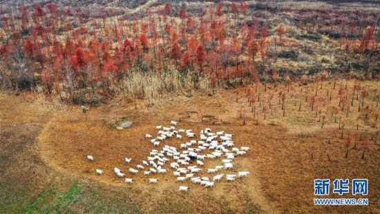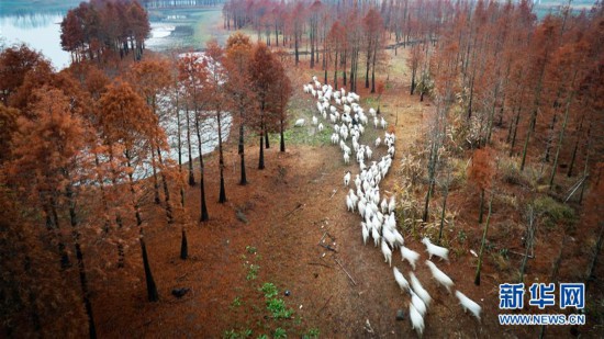 11月27日,牧歸的羊群行走在紅杉林中(無人機拍攝)。