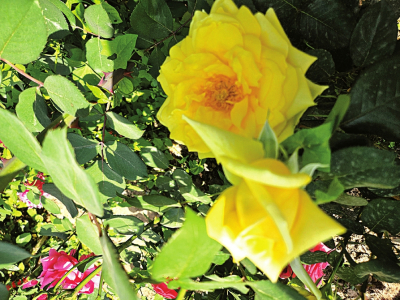 花廊。黃木香的單朵花雖小,但成千上萬(wàn)朵手牽著手簇?fù)碇_放,整株植物像黃金鍛造的噴泉,金黃色花朵如水流般潺潺而下,如同春日的暖陽(yáng)帶給人舒服的感受。它不僅好看,湊近了還能聞到陣陣清香,不同于牡丹的濃香,也不同于桂花香帶著的甜膩,它的氣味淡雅清新,隨著輕風(fēng)飄散至各處。