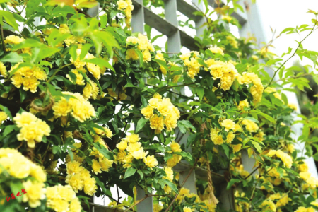 黃木香是薔薇科薔薇屬植物,攀緣小灌木,高度可達(dá)6米。花小型,多朵成傘形花序,花重瓣黃色。黃木香的生長(zhǎng)速度非???,輕輕松松就可以長(zhǎng)成一面花墻,它的枝條柔軟,像一個(gè)個(gè)藤蔓精靈,在園藝師的奇思妙想下,或成為墻壁精美的外衫,或可將一個(gè)普通的架子攀援成蜿蜒