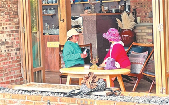 銀發(fā)游客在云南保山市隆陽(yáng)區(qū)新寨村聊天。