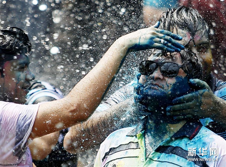 胡里節(jié)也叫“灑紅節(jié)”,人們?cè)谧约耗樕虾蜕砩贤可项伭希€向別人拋撒五顏六色的顏料和粉末,迎接春天的到來(lái)。新華社發(fā)(吳昂 攝)