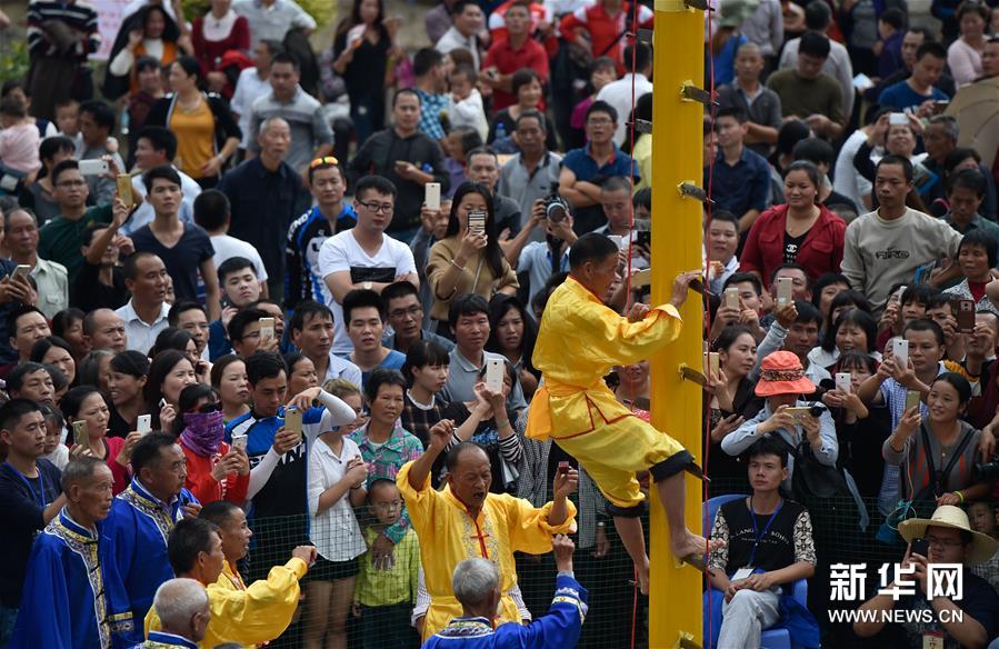 農(nóng)歷十月十五前后,福建西部武平縣各山村陸續(xù)進入農(nóng)閑時節(jié)。按照當?shù)仫L俗,不同村子各自擇日舉辦民間活動,其中較有代表性的就是“上刀山”絕技?!吧系渡健苯^技在閩西山村流傳已有數(shù)百年歷史,表演者需光腳順著磨得鋒利閃亮的36把鋼刀,攀登至8米高的杉木柱子頂部,接受長者祝福,祈求風調(diào)雨順、五谷豐登。新華社記者 宋為偉 攝