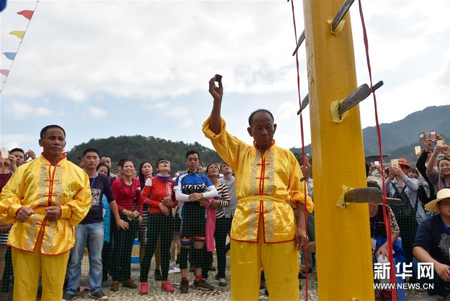 農(nóng)歷十月十五前后,福建西部武平縣各山村陸續(xù)進(jìn)入農(nóng)閑時(shí)節(jié)。按照當(dāng)?shù)仫L(fēng)俗,不同村子各自擇日舉辦民間活動(dòng),其中較有代表性的就是“上刀山”絕技?!吧系渡健苯^技在閩西山村流傳已有數(shù)百年歷史,表演者需光腳順著磨得鋒利閃亮的36把鋼刀,攀登至8米高的杉木柱子頂部,接受長(zhǎng)者祝福,祈求風(fēng)調(diào)雨順、五谷豐登。新華社記者 宋為偉 攝