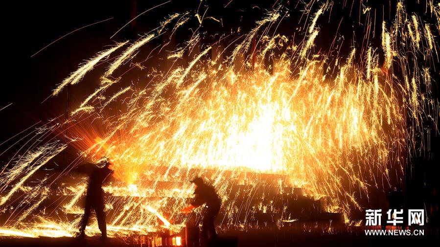 1月12日,河北磁縣開始舉行“打鐵花”慶新年活動(dòng)?!按蜩F花”是以小煉鐵爐將生鐵化成鐵水后,用木板將鐵水加鋸末打上天空,鋸末在空中燃燒形成“鐵花火雨”四濺飛揚(yáng)的景象。打鐵花”是當(dāng)?shù)貧v史悠久的民俗娛樂(lè)活動(dòng)。新華社發(fā) (趙鴻宇 攝)