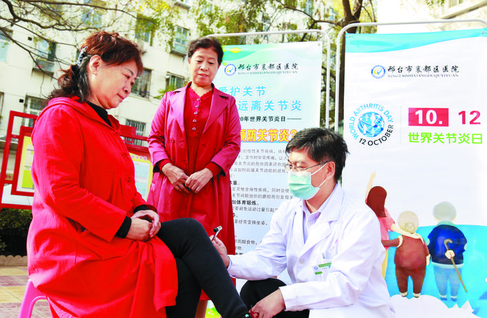 10月12日是世界關(guān)節(jié)炎日,河北省邢臺(tái)市襄都區(qū)醫(yī)院醫(yī)護(hù)人員走進(jìn)社區(qū),開展“愛護(hù)關(guān)節(jié),遠(yuǎn)離關(guān)節(jié)炎”義診活動(dòng),為居民解答關(guān)節(jié)疾病方面問題,向居民普及關(guān)節(jié)健康知識(shí)。 新華社發(fā)(張馳 攝)