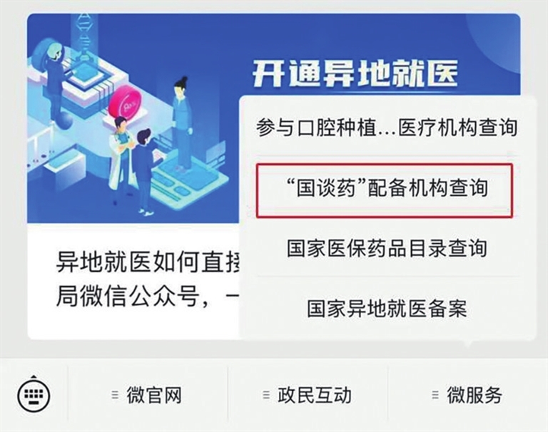 第一步:進(jìn)入“國家醫(yī)保局”微信公眾號,點擊微服務(wù)→“國談藥”配備機構(gòu)查詢,進(jìn)入查詢頁面。