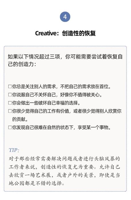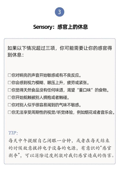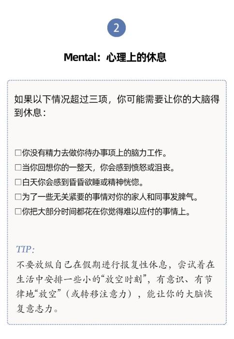 人們對于休息有不同層面的需要,休息與每一天的生活息息相關。單靠某一個具體的假期、某一種具體的活動(社交或者睡覺),并不能讓我們恢復到完全休息好了的狀態(tài)。