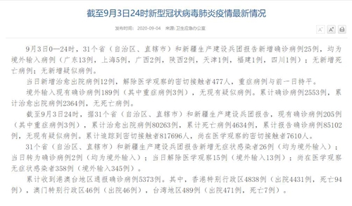 情況顯示,截至9月3日24時(shí),據(jù)31個(gè)省(自治區(qū)、直轄市)和新疆生產(chǎn)建設(shè)兵團(tuán)報(bào)告,現(xiàn)有確診病例205例(其中重癥病例3例),累計(jì)治愈出院病例80263例,累計(jì)死亡病例4634例,累計(jì)報(bào)告確診病例85102例,無(wú)現(xiàn)有疑似病例。累計(jì)追蹤到密切接觸者817696人,尚在醫(yī)學(xué)觀察的密切接觸者7610人。