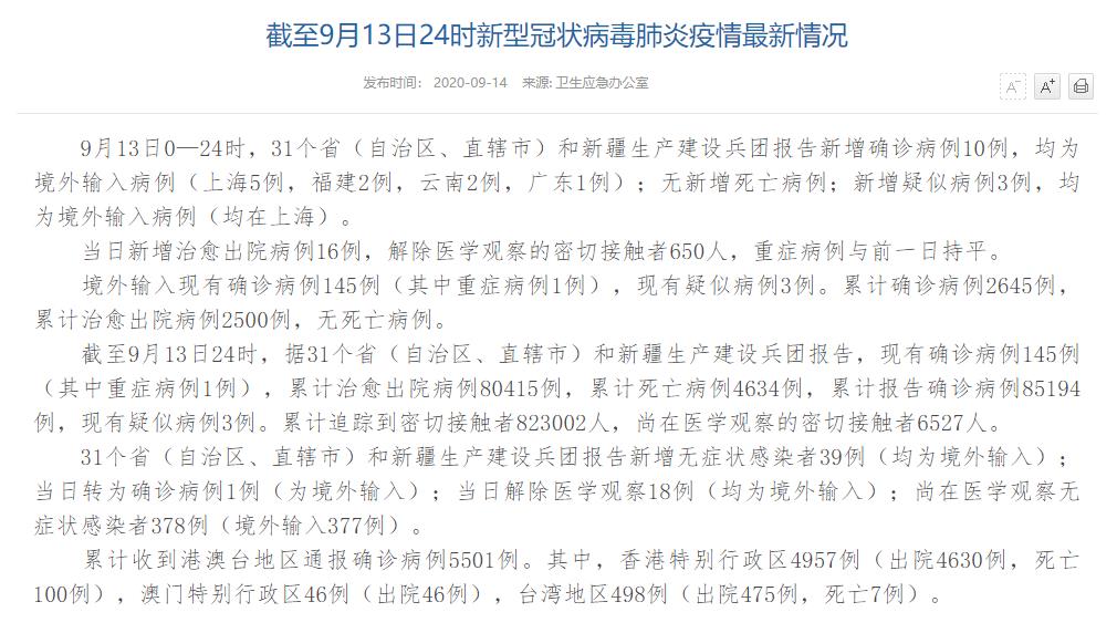 人民網(wǎng)北京9月14日(董童)國家衛(wèi)生健康委于今日在官網(wǎng)發(fā)布的《截至9月13日24時新型冠狀病毒肺炎疫情最新情況》(以下簡稱“情況”)提出,9月13日0—24時,31個省(自治區(qū)、直轄市)和新疆生產(chǎn)建設兵團報告新增確診病例10例,均為境外輸入病例(上海5例,福建2例,云南2例,廣東1例);無新增死亡病例;新增疑似病例3例,均為境外輸入病例(均在上海)。當日新增治愈出院病例16例,解除醫(yī)學觀察的密切接觸者650人,重癥病例與前一日持平。