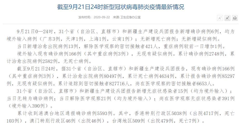 人民網(wǎng)北京9月22日電(董童)國(guó)家衛(wèi)生健康委于今日在官網(wǎng)發(fā)布的《截至9月21日24時(shí)新型冠狀病毒肺炎疫情最新情況》(以下簡(jiǎn)稱“情況”)提出,9月21日0—24時(shí),31個(gè)?。ㄗ灾螀^(qū)、直轄市)和新疆生產(chǎn)建設(shè)兵團(tuán)報(bào)告新增確診病例6例,均為境外輸入病例(廣東3例,天津1例,上海1例,云南1例);無(wú)新增死亡病例;無(wú)新增疑似病例。當(dāng)日新增治愈出院病例13例,解除醫(yī)學(xué)觀察的密切接觸者421人,重癥病例較前一日增加1例。