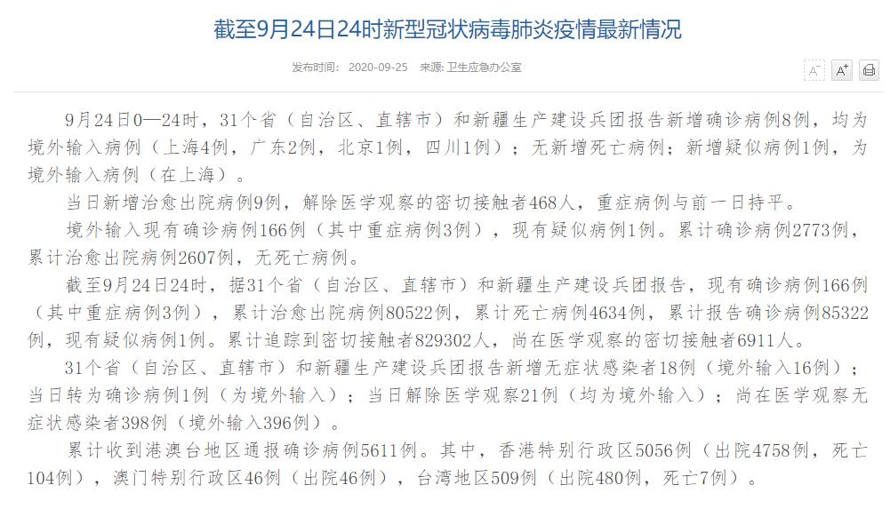 人民網北京9月25日電(董童)國家衛(wèi)生健康委于今日在官網發(fā)布的《截至9月24日24時新型冠狀病毒肺炎疫情最新情況》(以下簡稱“情況”)顯示,9月24日0—24時,31個?。ㄗ灾螀^(qū)、直轄市)和新疆生產建設兵團報告新增確診病例8例,均為境外輸入病例(上海4例,廣東2例,北京1例,四川1例);無新增死亡病例;新增疑似病例1例,為境外輸入病例(在上海)。當日新增治愈出院病例9例,解除醫(yī)學觀察的密切接觸者468人,重癥病例與前一日持平。