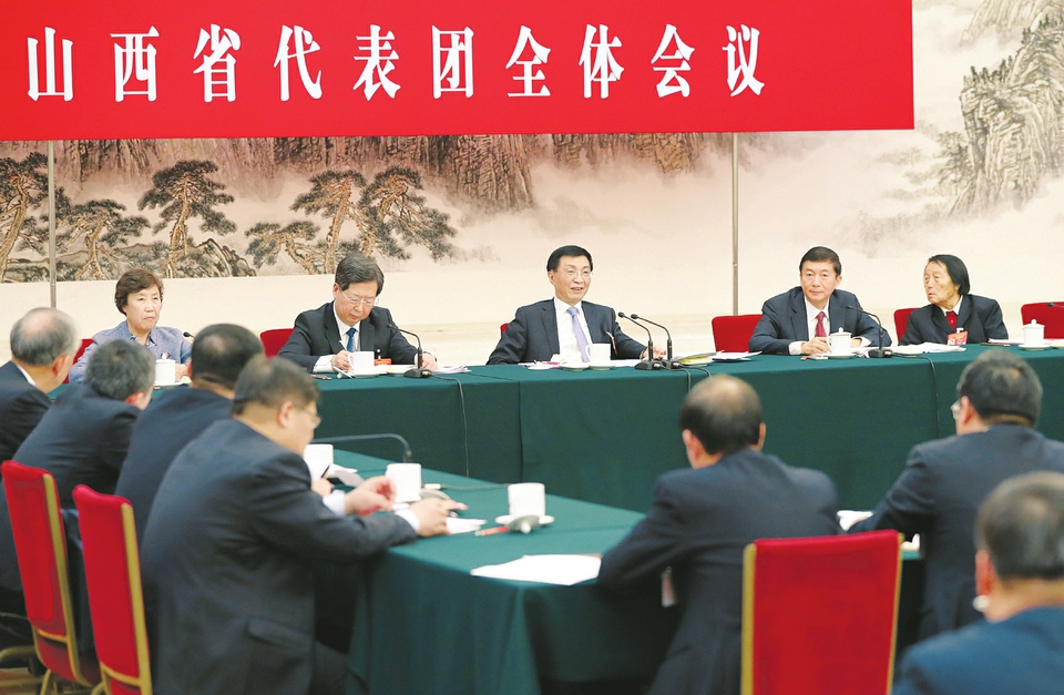 3月12日,中共中央政治局常委、中央書記處書記王滬寧參加十三屆全國人大二次會議山西代表團(tuán)的審議。新華社記者丁海濤攝
