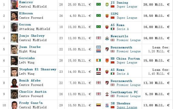 截至目前,中國俱樂部球員轉(zhuǎn)會費(fèi)(含轉(zhuǎn)入及轉(zhuǎn)出)排名前10位的分別是拉米雷斯(2800萬歐元)、埃爾克森(1850萬歐元)、熱爾維尼奧(1500萬歐元)、高拉特(1500萬歐元)、保利尼奧(1400萬歐元)、登巴巴(1300萬歐元)、瓜林(1200萬歐元)、吉安(1200萬歐元)、畢津浩(1114萬歐元)、阿蘭(1110萬歐元),1100萬歐元轉(zhuǎn)會費(fèi)的球員進(jìn)不了前10位,這在一年之前是不可想象的。而像格烏瓦尼奧(1100萬歐元)、張鷺(980萬歐元)、孫可(920萬歐元)、巴里奧斯(850萬歐元)、吉爾(850萬歐元)、孔卡(820萬歐元)、奧古斯托(800萬歐元)、蒙蒂略(750萬歐元)、迪亞曼蒂(690萬歐元)都被擠出了前10位。