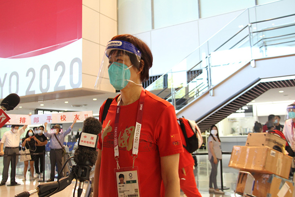 7月19日晚,中國女排主教練郎平在抵達東京成田機場后接受媒體采訪。李沐航攝