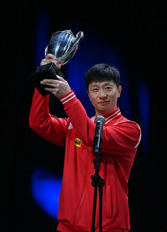 當(dāng)日兩場(chǎng)單打決賽之間,國(guó)際乒聯(lián)為2015年至2019年完成世乒賽男單三連冠的馬龍頒發(fā)了復(fù)刻圣·勃萊德杯。(蘇斌、謝江)