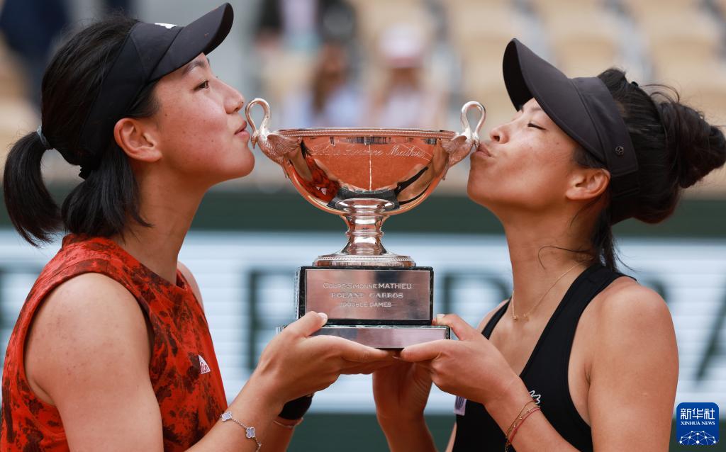 6月11日,王欣瑜(左)/謝淑薇親吻女雙冠軍獎杯。新華社記者 高靜 攝
