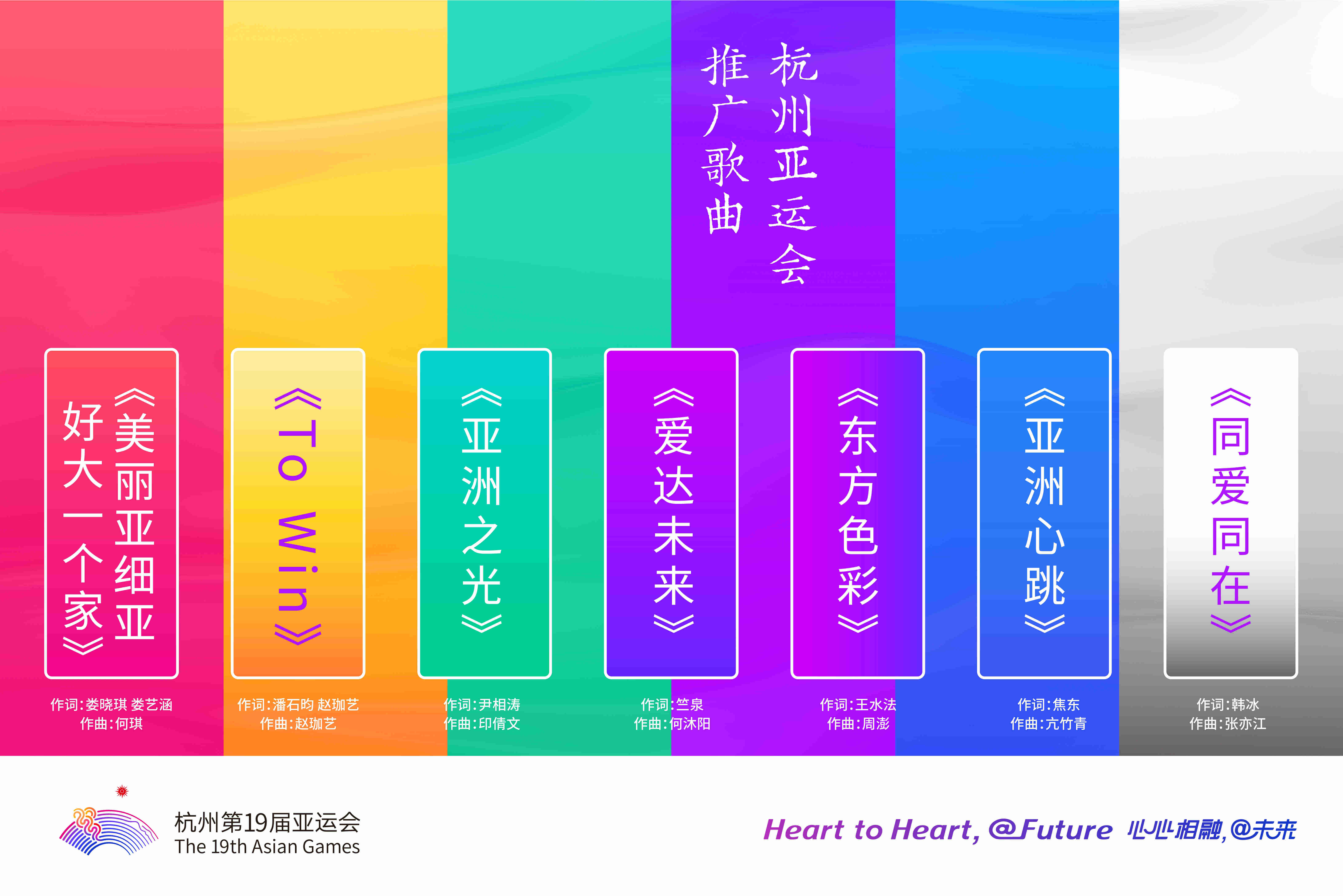 此次發(fā)布的《同愛同在》《亞洲心跳》《東方色彩》《愛達未來》《亞洲之光》《To Win》《美麗亞細亞 好大一個家》七首杭州亞運會推廣歌曲彰顯了不同的音樂風格,傳遞對亞運盛會的祝福和期待。