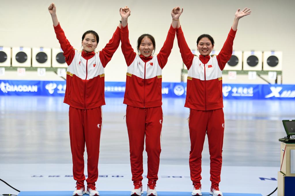 8月1日,中國隊(duì)選手熊亞瑄、林雅茜、王珂怡(從左至右)在頒獎(jiǎng)儀式上慶祝。當(dāng)日,在成都大運(yùn)會射擊女子25米手槍比賽中,她們獲得團(tuán)體冠軍。新華社記者曹祎銘攝