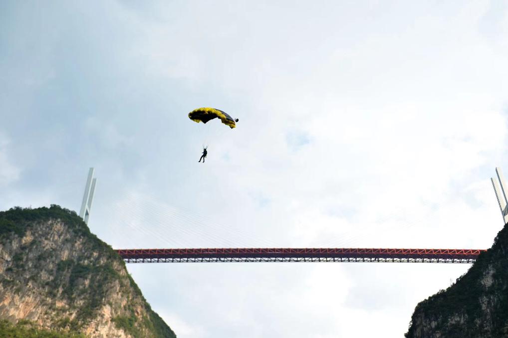 新華社貴陽(yáng)9月6日電(記者駱飛、吳思)6日上午,極限運(yùn)動(dòng)員們相繼從北盤江大橋上飛躍而下,拉開(kāi)了在貴州省六盤水市舉行的2023國(guó)際高橋極限運(yùn)動(dòng)邀請(qǐng)賽世界第一高橋站低空跳傘角逐的序幕。