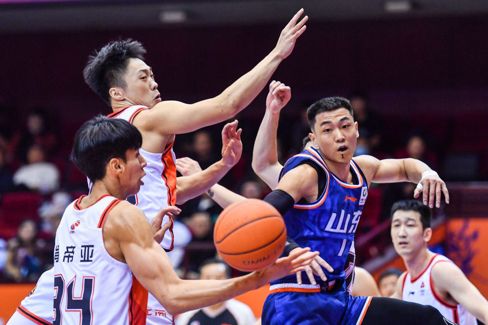 12月7日,山東隊(duì)球員高詩(shī)巖(前右)在比賽中傳球。新華社記者 朱崢 攝