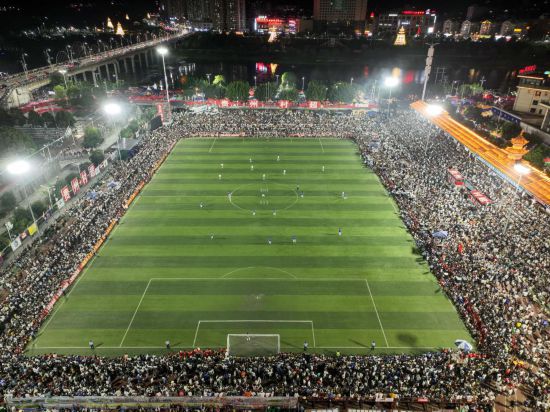 這是7月29日拍攝的夜幕下的“村超”總決賽現(xiàn)場(chǎng)(無人機(jī)照片)。新華社記者 歐東衢 攝