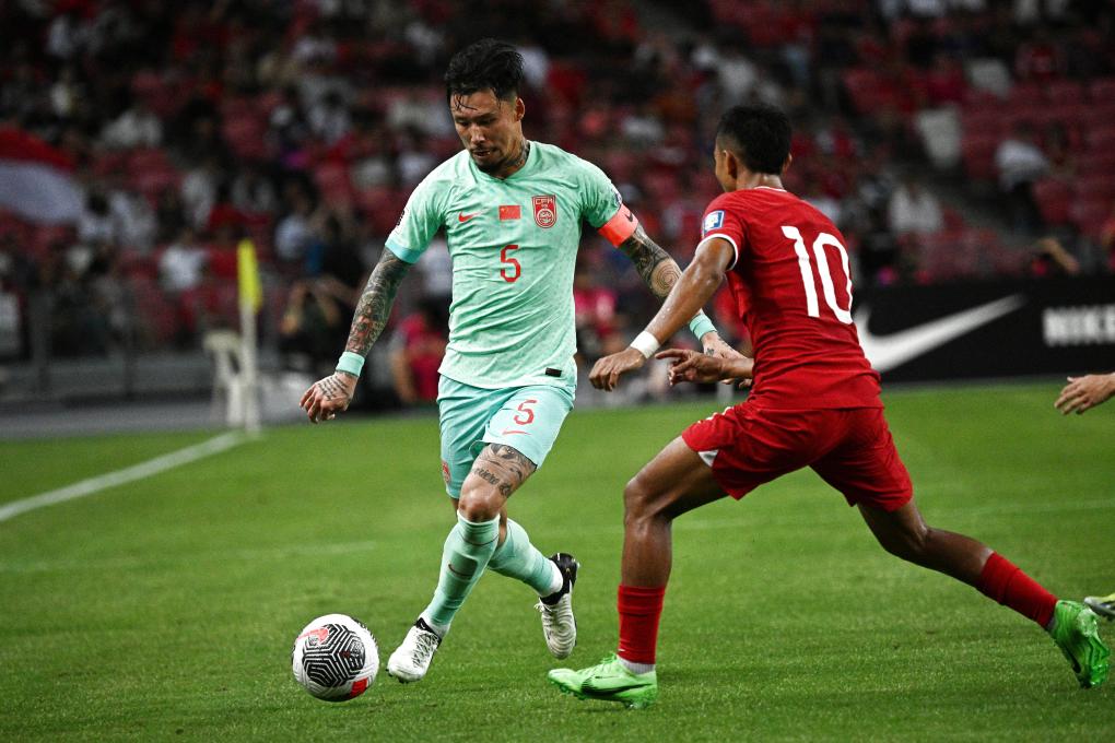 3月21日,中國隊(duì)球員張琳芃(左)在比賽中與新加坡隊(duì)球員拉姆利拼搶。新華社發(fā)(鄧智煒攝)