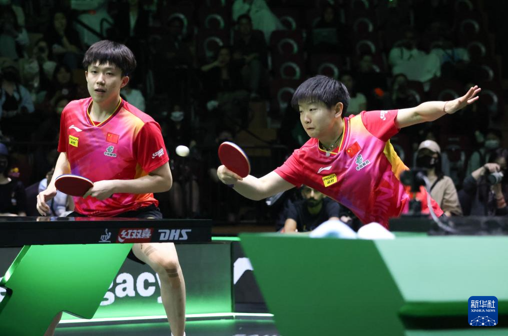 5月9日,王楚欽/孫穎莎(右)在比賽中。新華社記者 王海洲 攝