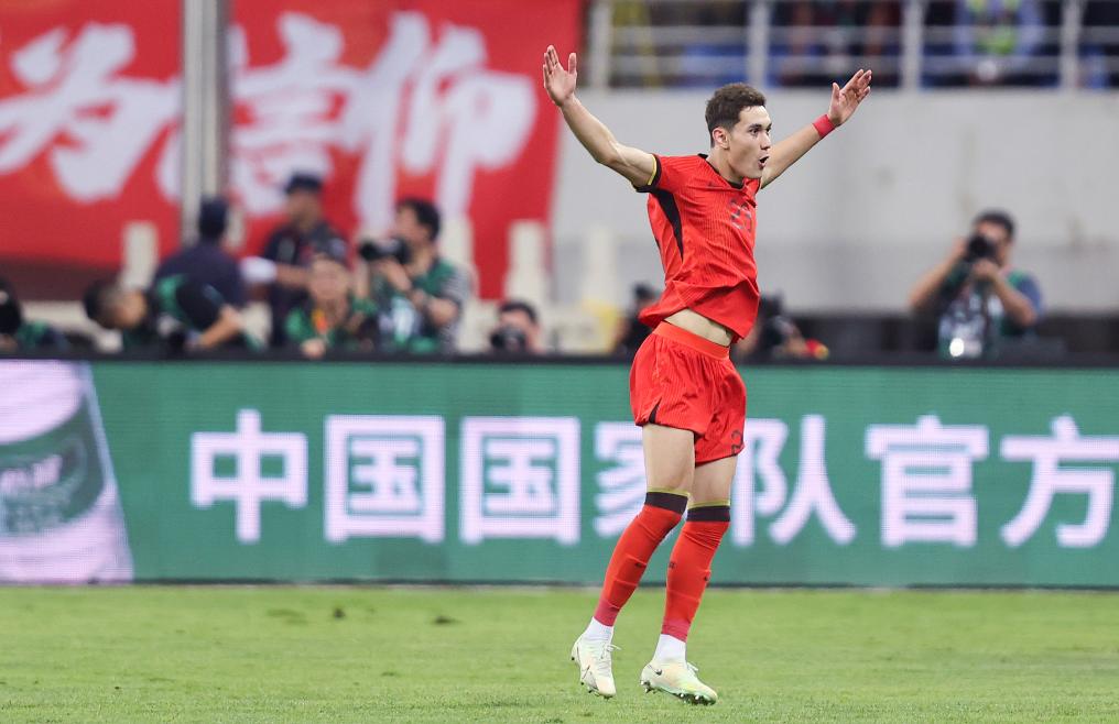 6月6日,首次代表國家隊出場的中國隊球員拜合拉木在進(jìn)球后慶祝。新華社記者 賈浩成 攝